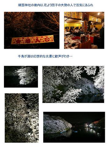早いもので・・あっという間の一年・・今年は暖かい夜桜見物でした それにしても大勢の人・人・人・・・上を見上げながら歩き・・首が痛くなったところでさあ・・・私たちもお団子へGo