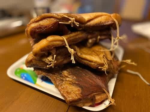 今年も作りました 2週間漬け込んだ豚肉でベーコンを 3日間ピックル液に漬けこんだ鶏肉でスモークチキンを 鴨肉 チーズも 桜チップで 燻煙 良い出来栄え