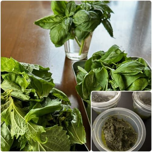 先日友人がベランダ菜園に大葉・バジル・にらを植えていってくれた それが立派に育って大量に収穫できた 塩漬けした残りの大葉とニンニクと松の実とバジルでジェノベーゼソースを バジルチキン ピザ パスタ 色々使える にらは溶き卵とスープに 香りよく柔ら…