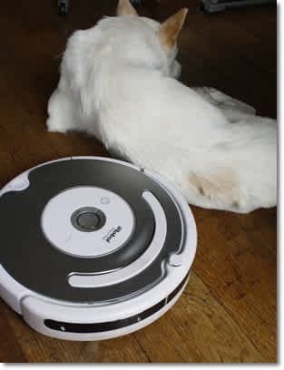 2011-07-25 ワンコとお掃除 ロン この季節の一番の悩み・・ワンコの抜け毛 夏毛が生えそろうまで・・家じゅう毛だらけ そこで大活躍するのがダイソン掃除機・ペットグルーミングツール ブラッシングしながら、抜け毛を吸い取る おとなしく気持ち良さそうに・・ すっきりした後は チョットうらやましい・・ それでも毛がフワフワと部屋に目立つようになるとルンバのお出まし~ 嫌がるかな?と思っていると・・ 全然平気 年のせいで耳がかなり遠くなったので、怖がらなくなった様子・・ 背中をお掃除してもらっている