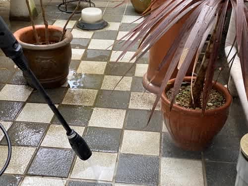 2020-05-04 ケルヒャーで掃除 独り言 10日まで会社はお休み 連休中の父さん 課題を着々とこなしています その1つ ケルヒャーを使って掃除 数年前 大掃除用に買ったケルヒャー か弱い私の手には負えません で・・・父さんの出番 中庭のタイルを みるみる汚れが取れていくのは気持ちが良い 綺麗になって心も五月晴れ 濡れたついでと 玄関周りお風呂場の掃除も お疲れ様~~ 気持ちの良い風がそよそよ ランチwith・・音楽を聴きながら