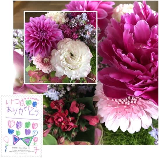 2018-05-14 母の日のお花 孫 母の日に長男一家から送られてきたお花 MIDORI/Green Village Inc 萌生ちゃんのお友達のお花屋さんから いつもとてもおしゃれで素敵 萌生ちゃんのお手紙付 ありがとう